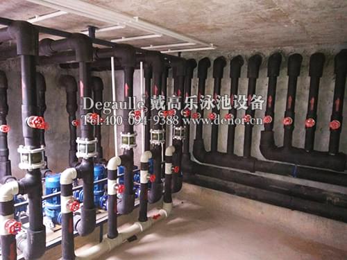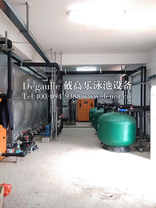 女賓池水深0.7m;總水量約20m³,水處理過(guò)濾系統(tǒng)使用的是2臺(tái)戴高樂(lè)過(guò)濾纖維沙缸,2臺(tái)循環(huán)增壓泵;消毒系統(tǒng)使用的是2臺(tái)紫外線消毒器;恒溫泳池系統(tǒng)使用的是2臺(tái)戴高樂(lè)泳池?zé)岜茫蝗斯厝a(chǎn)生機(jī)1套。